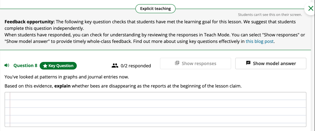 Teach Mode lets teachers intentionally model what to do and how to do it. A lesson includes learning goals accompanied by Key Questions, which give students an opportunity to demonstrate their progress against the learning goal. This makes the purpose of the lesson transparent to students.