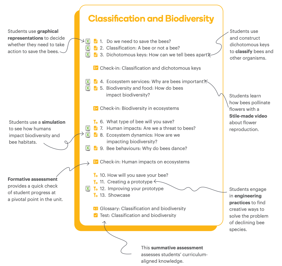 Learning sequences within lessons use SOLO taxonomy to scaffold students from lower-order thinking to higher-order thinking. This is evident in the cognitive verbs that are included in each Stile question. Our science team also uses the 5E instructional model to structure learning at the unit and lesson level. You can learn more about this in the Pedagogical Model blog of this VTLM series here.