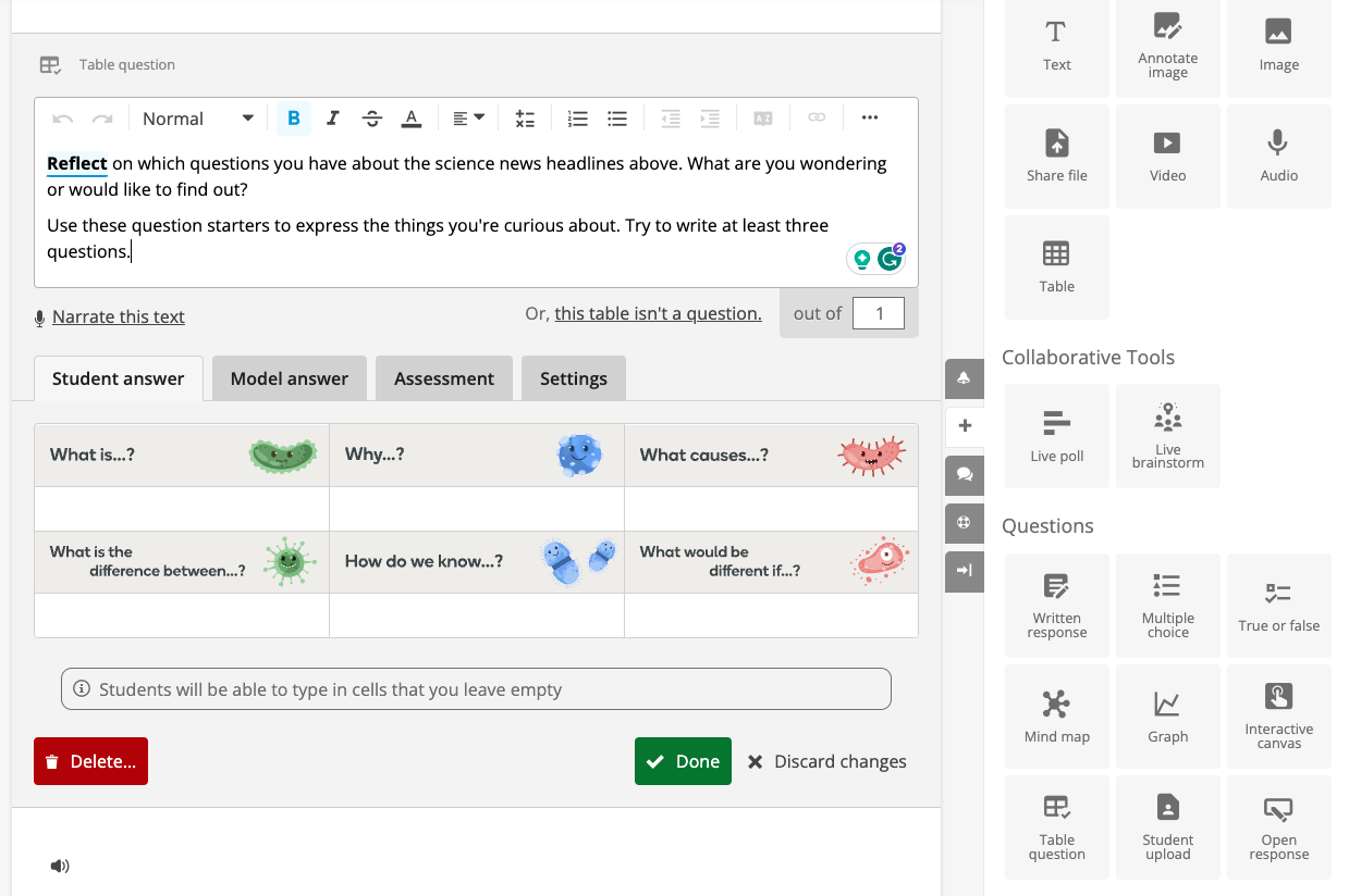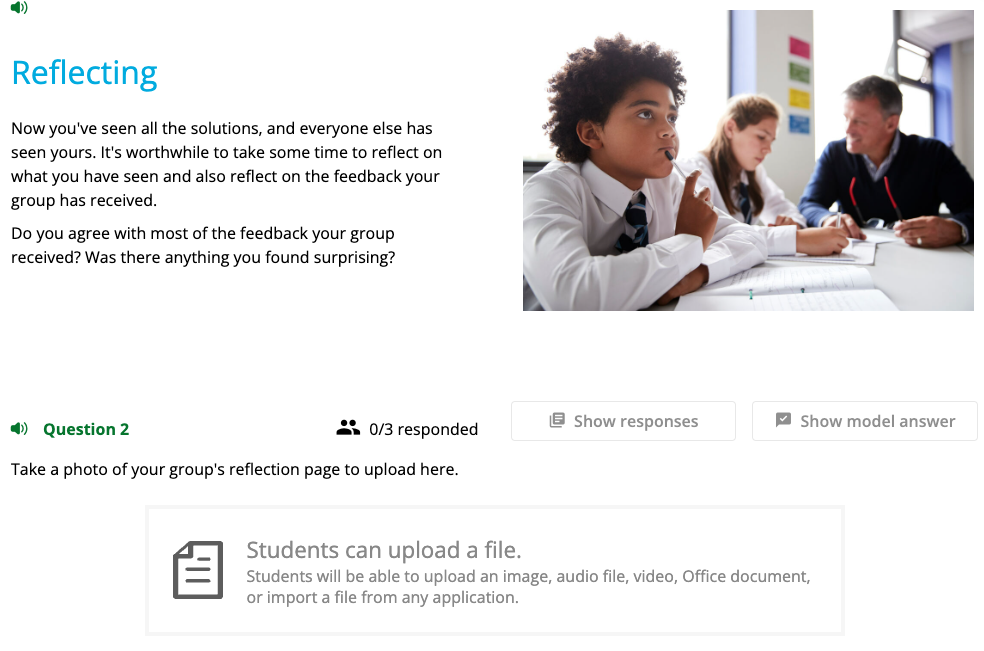 Stile uses collaborative questions and tasks where students work together to achieve a common goal. These range from collaborative class brainstorms and polls to practical activities with a partner or group work tasks such as research projects or building models. Teaching notes included in these lessons provide teachers with guidance on facilitating discussion and respectful questioning between students.