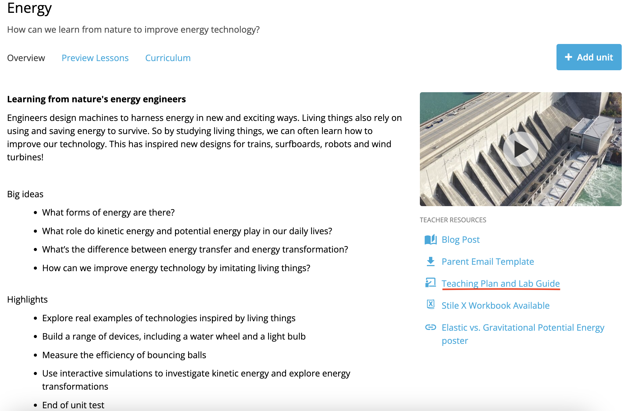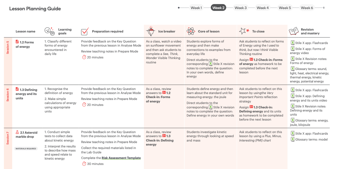 Take a look at the resources and materials required for the unit. We’re also working on developing a Lab Guide for each unit, which includes a comprehensive list of materials and helpful how-to videos for hands-on and practical activities. Keep an eye out for Lab Guides, which will be added to the back of each Teaching Plan. You can read more about the improvements we've made to practical activities in Stile here. - Lesson planning guide
