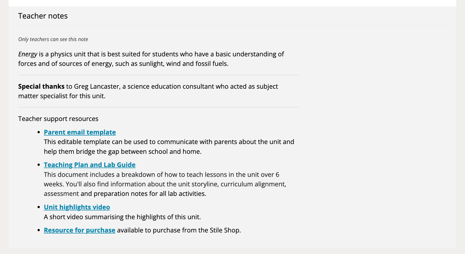 Once you’ve added the unit to your subject, the Teaching Plan is available in the Teacher Notes section at the bottom of the unit’s folder. We recommend printing the document and setting aside ten minutes or so to read through it. Check out an example Teaching Plan from our Energy unit here.