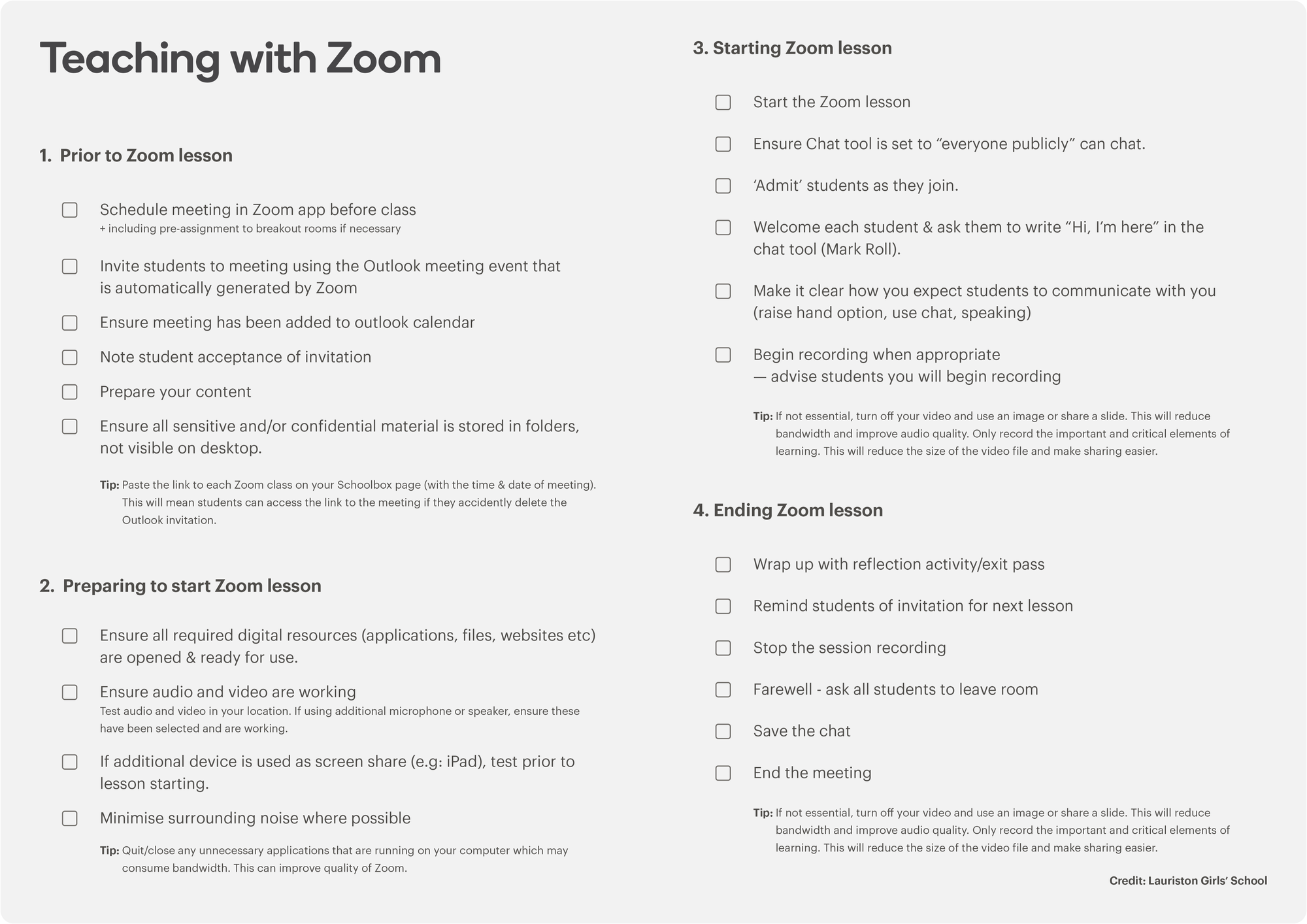 - Checklists: Owen put together a checklist that steps staff through using Zoom before, during and after a lesson. You can find his Zoom checklist below or download the image here.