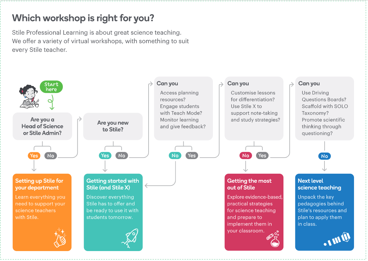 We’ve recently expanded our offering of virtual Stile Professional Learning workshops to four separate options that suit different audiences and experience levels with Stile. We’ve also developed a handy flow chart to help you work out which one is right for you. Try it out below.