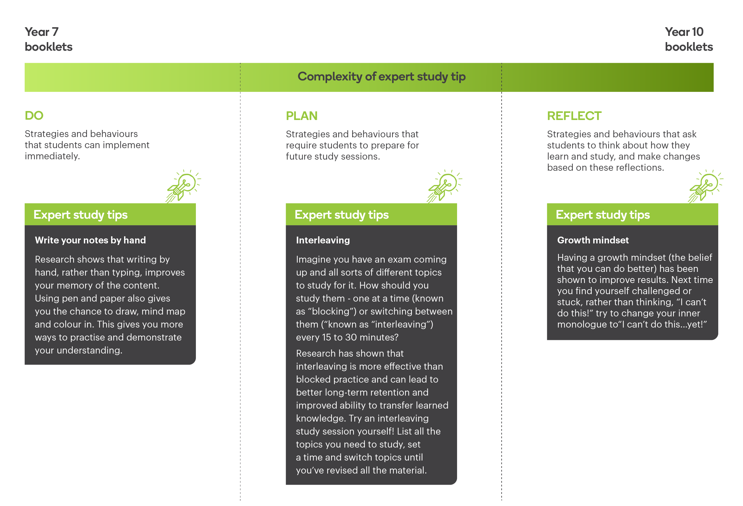 Study skills are embedded throughout Stile's digital revision worksheets and Stile X booklets in the form of Expert study tips. These tips teach students revision skills, attitudes and mindsets to help them become lifelong learners. We’ve called them expert study tips because they’re all backed by cognitive research. Read our Science of Stile's Revision Resources blog series here.