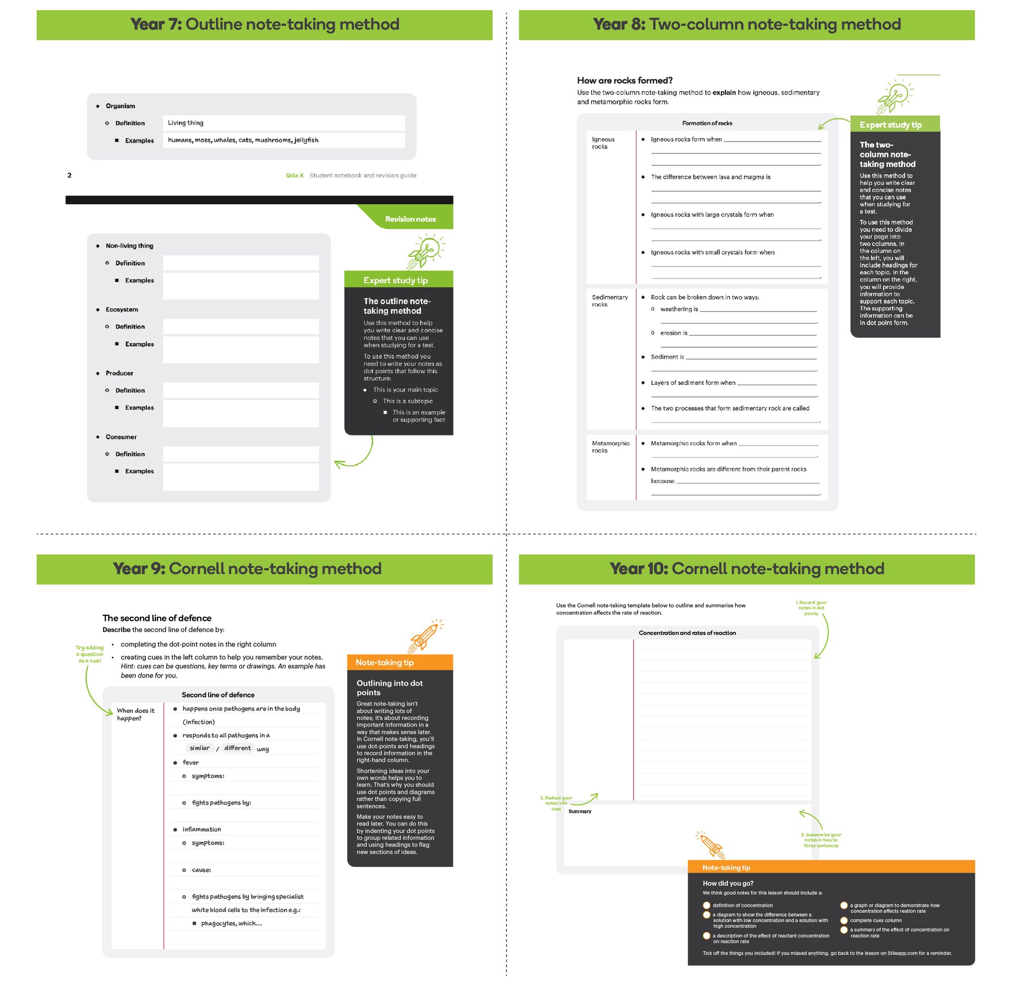 In particular, the Year 9 and 10 revision resources place a greater focus on note-taking skills to help ensure students are set for success in senior science. Students are explicitly taught each of the skills required to take Cornell notes in isolation throughout each chapter:
